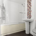 - Bathroom with white suite and shower over bath